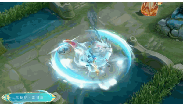 三技能:亚连跳跃空中时,选定目标时地面中心会出现莲花绽放以及冰山和风雪的设计,下落时会有白狼出现和莲花及地面莲花为设计点的装饰花纹。防护罩以白狼图腾和冰雪为设计点。
