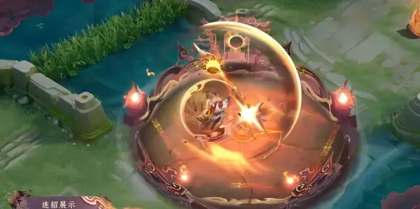 三技能:魔尊高高跃起,空中划过暗红色魔焰拖尾。 选定区域生成魔化图腾,落地时周围竖起剪纸质感的魔宫,火焰与火星弥漫。