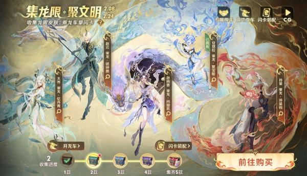活动规则:活动期间,收集不同数量龙限皮肤可获得不同奖励,收集越多奖励越丰厚;购买单款龙限皮肤可将自己的龙年祝福分享给其他玩家,同时自己还能额外获得新年龙运祝福好礼,一起欢聚龙年!
