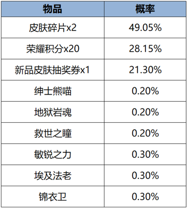 购买礼包必得红蓝对决(1日),可额外随机获得以下之一:绅士熊喵、地狱岩魂、救世之瞳、敏锐之力、埃及法老、锦衣卫、荣耀积分x20、新品皮肤抽奖券x1、皮肤碎片x2。