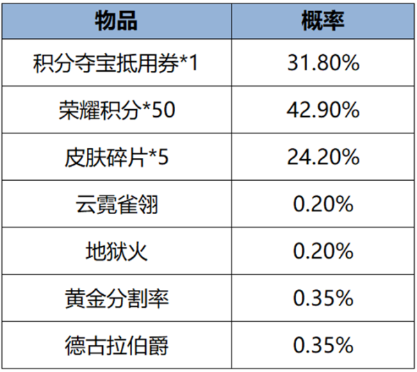 购买礼包必得酷炫机甲(1日),可额外随机获得以下之一:云霓雀翎、地狱火、黄金分割率、德古拉伯爵、荣耀积分x50、积分夺宝抵用券x1、皮肤碎片x5。