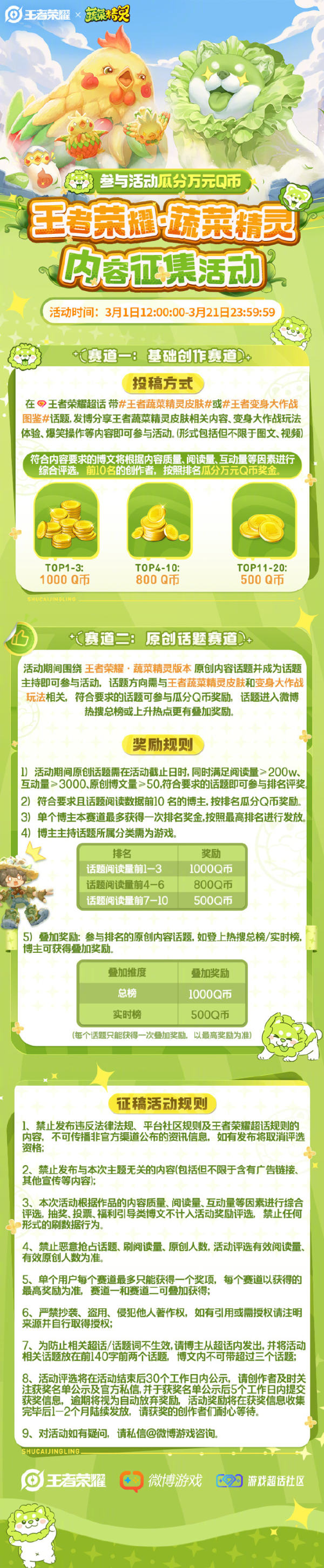 赛道二【原创话题赛道】:活动期间围绕王者荣耀·蔬菜精灵版本原创内容话题,并成为话题主持即可参与活动,话题方向需与王者蔬菜精灵皮肤和变身大作战玩法相关,符合要求的话题可参与瓜分Q币奖励,话题进入微博热搜总榜或上升热点更有叠加奖励!