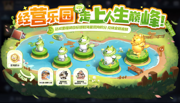 活动规则: 建设乐园获取乐园币,升级达成里程碑目标可以获得大量菜狗积分,免费兑换钟无艳联动皮肤 。