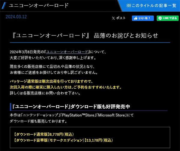 Atlus官方在致歉文中表示,他们非常感谢玩家们对《圣兽之王》的热情支持和喜爱。然而,由于游戏上市后的火爆程度远超预期,导致库存迅速告急,给玩家们带来了不便和困扰。对此,他们深感抱歉,并承诺将全力以赴解决缺货问题。