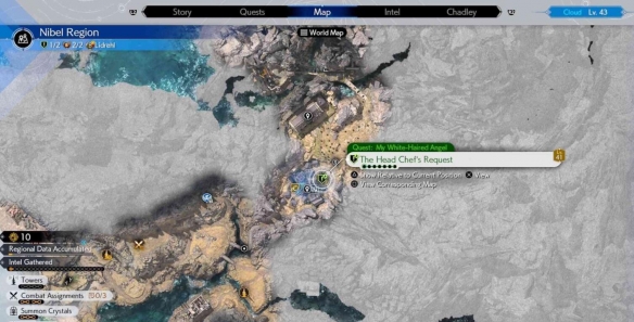 触发条件:白毛天使支线是在第11章的结尾解锁,任务位置在尼贝尔海姆-村庄厨房(水塔广场)或检查尼贝尔海姆布告板处接到任务,地图如下: