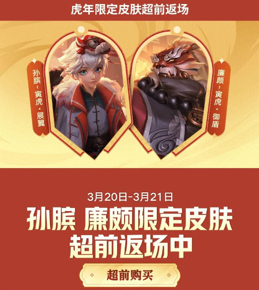 孙膑寅虎展翼限定皮肤与廉颇寅虎御盾限定皮肤将于3月20日10:00 至3月28日23:59 在微信QQ集市提前上线。随后,这两款皮肤将于3月22日0:00 至3月28日23:59 在游戏商城内正式返场。