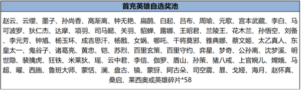 4、新版首充中英雄自选奖池的可选英雄范围,未来将随版本迭代进行持续更新,详见后续公告。