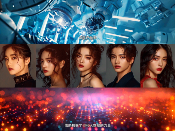 AI开场视频: 滚动播放的开场宣传片,也是由AI制作生成的。从整体分镜脚本设计,到结合文案生成2440张高清图片、714个4秒视频片段,再到配音、配乐、整体剪辑,以及高清放大和插帧,每个环节都展现了AI技术的强大力量。