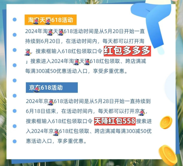 首先,划重点! 今年的京东的618红包口令是「天降红包558 」,淘宝618红包口令是「红包多多多 」记得每天去领,因为领的红包大小和你搜索的什么口令有关哦!