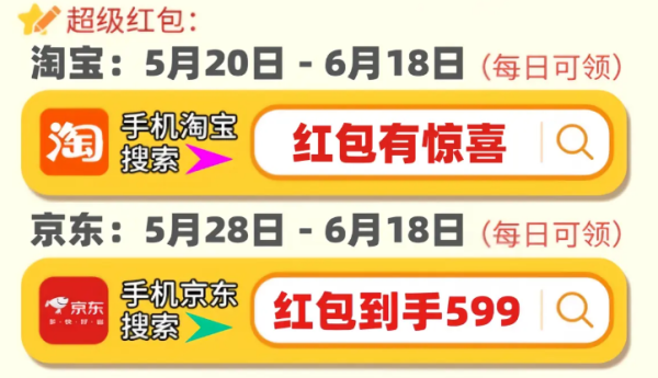 6月18日当天:京东APP搜索:红包到手599,这一天是京东的店庆日,通常会有终极优惠和惊喜活动,几乎所有商品都将参与促销,优惠力度达到顶峰。