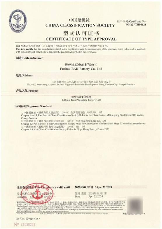 在全球性的环保浪潮与技术革新的双重推动下,电动船舶已逐渐成为绿色航运的新航标。近日,深圳市比克动力电池有限公司宣布其自主研发的100Ah方形磷酸铁锂电芯成功获得中国船级社(CCS)型式认可证书。