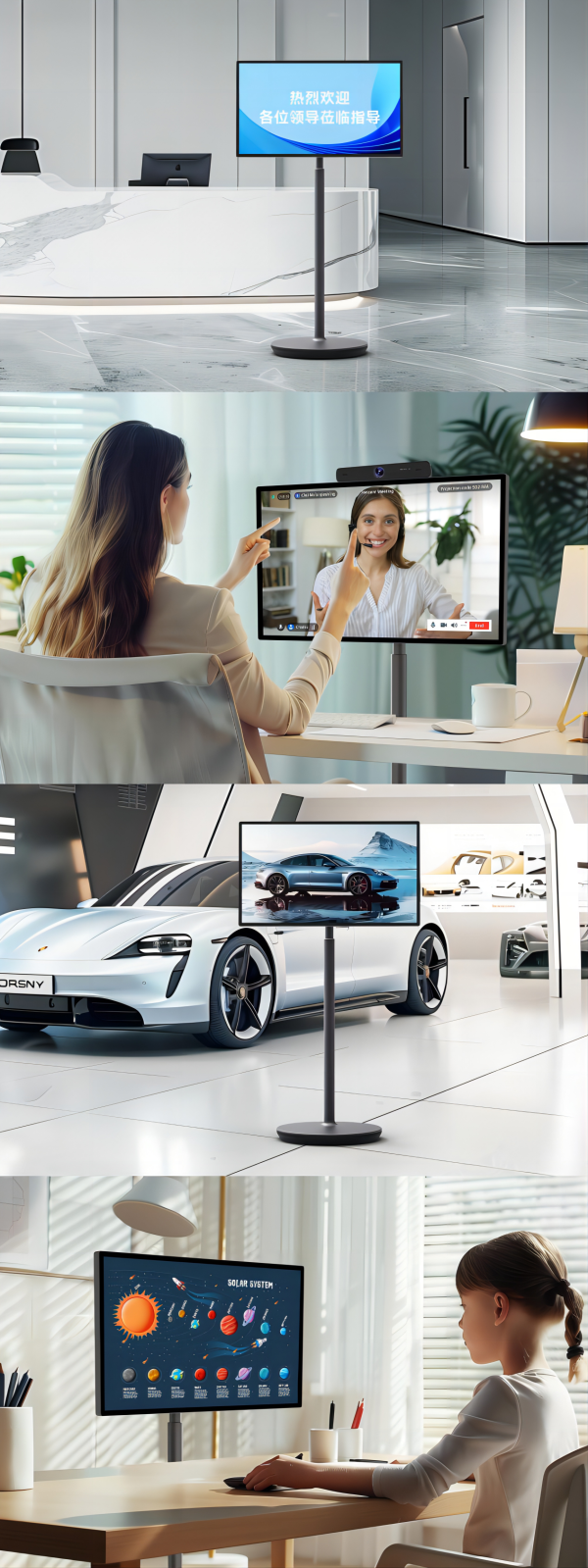 当然,除了用于日常会议、团队协作,对于迎宾接待、展览展示、门店宣传、居家娱乐学习皓丽移动会议屏也都是大一利器。