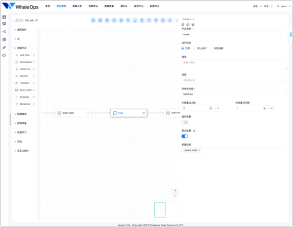新增了BREAK逻辑任务节点。该节点允许在执行到此节点时自动暂停流程并发送告警通知,从而让用户可以手工参与到工作流的安排中。这一功能使得工作流调度更加灵活,并能够及时响应和处理异常情况。