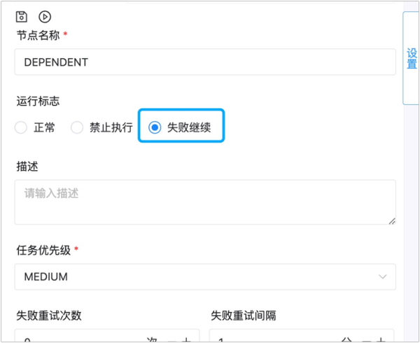 弱依赖模式: 为了提高任务调度的灵活性,我们新增了任务组件的运行标志“失败继续”的弱依赖模式。在这种模式下,当前任务节点执行失败(例如等待1小时还为满足要求,而失败)不会阻断当前流程,后续任务将正常提交执行。