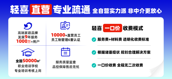 因而,在所推出的“防水补漏、管道疏通”的新服务上,轻喜到家为用户加上了强力保障,真正做到一口价收费,全程无二次收费,0元检测再下单。如今,轻喜到家“防水补漏、管道疏通”直营服务已全面上线,专业、高效助力千万家庭用户解决“防、补、堵”难题。未来,轻喜到家将秉持初心,革新家政服务,用实践把“提升中国家庭生活品质”的初心一步步化为现实,为更多消费者提供优质到家服务!