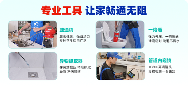 大部分家庭遇到管道堵塞时,选择自己疏通的话,在没有专业工具的帮助下不仅耗时耗力,并且力度把握不当,会造成管道破裂。而找人疏通的话,容易坐地起价,小病大修,典型出钱找罪受。
