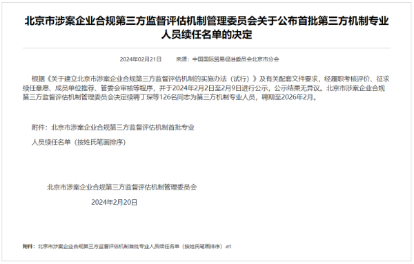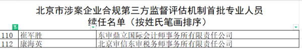 据悉,经北京市涉案企业合规第三方监督评估机制管理委员会决定,续聘东审鼎立国际会计师事务所有限责任公司董事长崔军胜和北京审信东审税务师事务所有限责任公司合伙人康海英为北京市涉案企业合规第三方监督评估机制的首批专业人员,聘期延长至2026年2月。