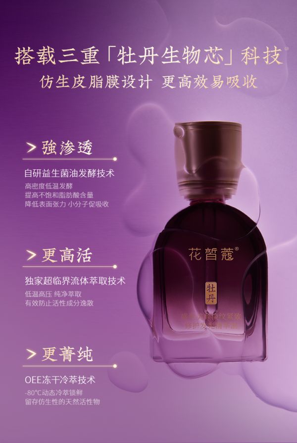 此次推出的牡丹盛世美颜发光精华油新品,采用了其自有专利技术——一种抗初老肌肤绽放活性油组分及应用,同时兼具了花皙蔻独有的三重“牡丹生物芯”科技仿生皮脂膜设计:自研益生菌油发酵技术可降低精华油表面张力,可实现小分子吸收,确保不闷腻、不糊脸;低温高压、纯净萃取的独家超临界流体萃取技术,能有效防止活性成分逸散;-80°C的OEE冻干动态冷萃技术,能锁鲜留存仿生性的天然活性物,有效缓解皮肤干燥粗糙、屏障脆弱、皮肤松弛、皱纹细纹等肌肤难题,从多维度强化抗衰屏障,为肌肤带来深层次的滋养与呵护。