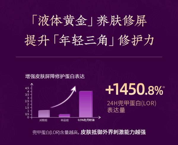 科学研究表明,构成皮肤“屏障”的主要成员之一是角质形成细胞。在角质形成细胞中,又有两个很重要的蛋白质:兜甲蛋白和丝聚蛋白。兜甲蛋白含量越高,皮肤抵御外界刺激能力越强。花皙蔻新品精华油中含有的牡丹籽油,不仅富含56.31%的OMEGA-3及92%+不饱和脂肪酸的天然油脂结构,24小时兜甲蛋白(LOR)表达量更是高达1450.8%,可有效增强皮肤屏障修护蛋白表达,直补皮脂膜所需养分,卓效养肤修屏。更值得一提的是,新品牡丹发光精华油还采用了花皙蔻独家研发出超临界流体萃取技术,能够完整保留牡丹活性成分,外修屏障、内促胶原,两大路径协同构筑健康屏障,对抗内源性衰老。