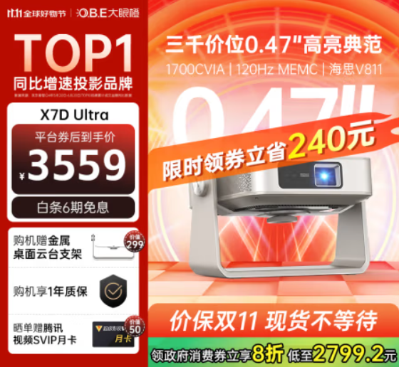 双十一期间,大眼橙X7D Ultra投影仪带来极具吸引力的优惠活动。京东平台双十一券后价3559元,还可领政府补贴立享8折,到手价低至2799元,下单还送云台支架、腾讯视频会员等福利,让你在享受高品质投影体验的同时,获得更多实惠和惊喜。