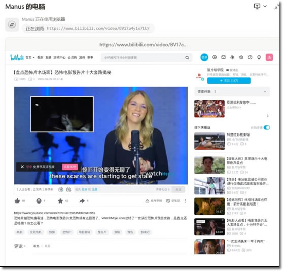 这就是人工智能的第二步:你交给它一个任务时,它不是告诉你怎么做,而是直接做好给你,独立思考,然后执行工作,这是他和其他AI工具最大的一个不同。如下图所示,Manus会打开B站找内容,是不是有点细思极恐了?