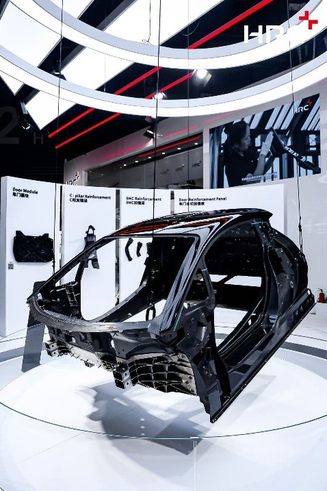 在“极‘智’新材”展区,HRC重磅推出了多项具有行业里程碑意义的创新成果,引发广泛关注,其中“超级碳舱”更是成为全场瞩目的焦点。该产品由HRC独家为客户开发制造,实现了较传统钢铝方案减重30%的显著效果,轻量化系数突破行业极限,仅为0.95。在保持极致轻量化的同时,HRC还通过集成应用十余种先进连接工艺并在关键部位采用PMI嵌件等创新技术,确保在极端工况下仍能保持卓越的操控稳定性和碰撞安全表现,完美平衡了轻量化、安全性与驾驶乐趣的三重技术目标。作为目前全球最大的单体壳碳舱,“超级碳舱”开创了将碳纤维作为主要车身结构材料运用在国内高端量产车型上的先河,不仅展现了碳纤维在汽车结构件应用中的巨大潜力,也为未来汽车的“轻量化骨骼”树立了全新的技术标杆。
