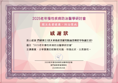2025年5月25日,由澳门营养学会主办,澳门科技大学药学院及澳门协和医院合办,澳门科学技术协进会及老年全人健康促进会支持的 “2025 老年慢性疾病防治医学研讨会”在澳门科技大学举办。北京大学华东产业研究院商业转化中心副主任、中科稀珍(北京)健康科技有限公司首席科学家闫硕博士应邀出席本次研讨会,并发表了题为《中科稀苷橡胶树种子油逆转颈动脉斑块的临床研究》的主题演讲,为老年慢性疾病防治领域带来了前沿的科研成果与创新见解。