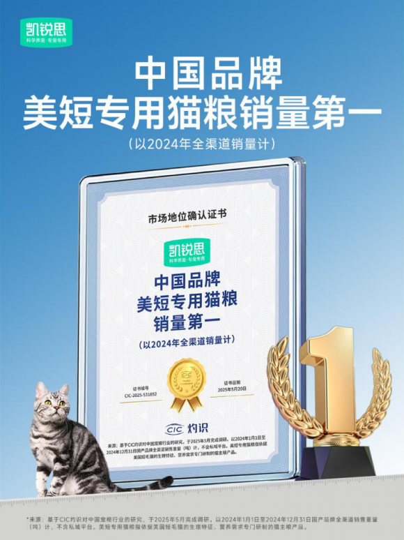 在宠物食品行业加速向精细化、专业化演进的进程中,凯锐思凭借其美短专用猫粮的全渠道销量表现,获得国际咨询机构CIC灼识颁发的“中国品牌美短专用猫粮销量第一(以2024年全渠道销量计)”市场地位确认证书(证书编号:CIC-2025-531852)。