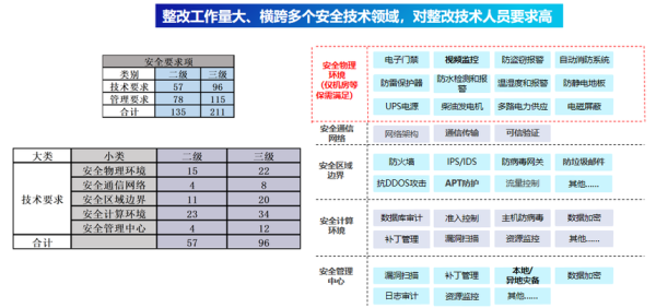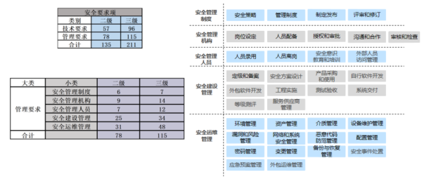 包括安全物理环境、安全通信网络、安全区域边界、安全计算环境、安全管理中心在内共96项技术要求;包括安全管理制度、安全管理机构、安全管理人员、安全建设管理、安全运维管理在内的115项管理要求。