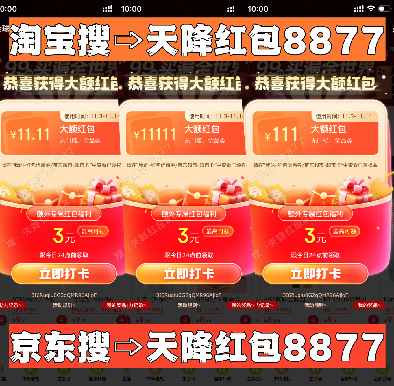 划重点!今年天猫/淘宝和京东最新的双十一统一红包口令都是「天降红包8877」一定要记住!领的红包大小和你搜索的什么口令有关的!“天降红包8877”这个双平台唯一红包口令包领到大的!记得每天去领!