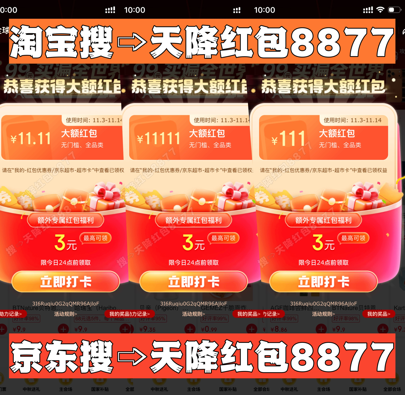 划重点!今年天猫/淘宝和京东最新的双十一统一红包口令都是「天降红包8877」一定要记住!领的红包大小和你搜索的什么口令有关的!“天降红包8877”这个双平台唯一红包口令包领到大的!记得每天去领!