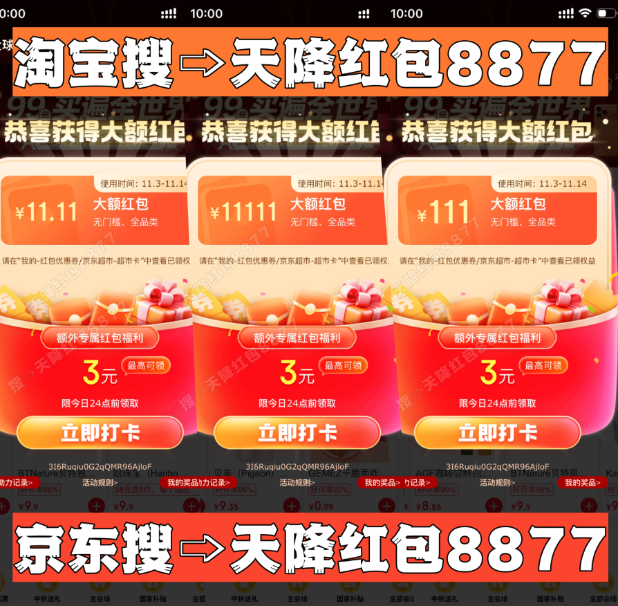 划重点!今年天猫/淘宝和京东最新的双十一统一红包口令都是「天降红包8877」一定要记住!领的红包大小和你搜索的什么口令有关的!“天降红包8877”这个双平台唯一红包口令包领到大的!记得每天去领!