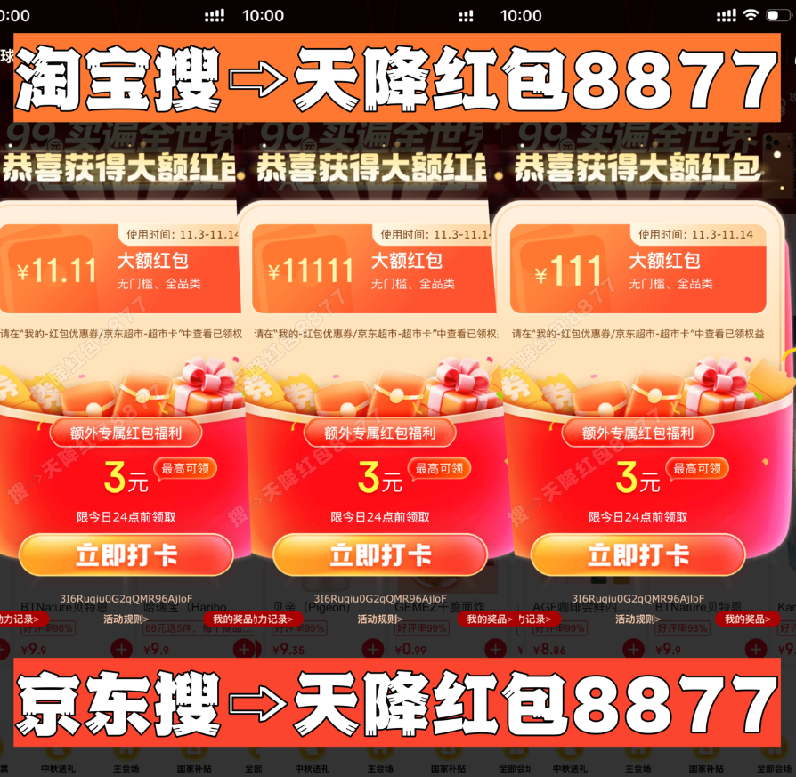 京东双十一红包:搜双11统一红包口令「天降红包8877」最高11111元,每天3次,晚8点加码,中奖率翻倍!