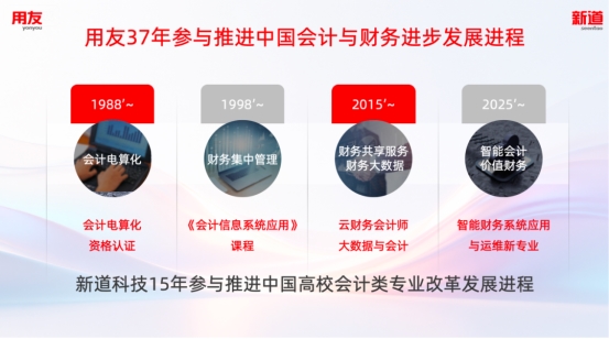 用友持续37年参与并推进中国会计事业高质量发展进程,从1992年开设《计算机在会计中的应用》课程至今,用友、新道携手院校经历了从电算化人才、云财务会计人才到智能会计人才培养的时代变迁。