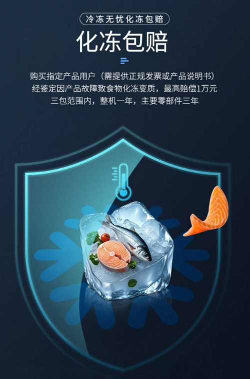 在最重要的冷冻方面,此系列产品采用大冷量压缩机融合混合制冷技术,R290制冷剂,创新-38℃深冷储存,融合细胞级冷冻科技,使海鲜的中心温度迅速下降,从而保证冻得深、冻得快、冻得鲜,像金枪鱼、帝王蟹、大龙虾等高档生鲜都可以放心存。可以快速均匀锁住DHA、蛋白质等营养不流失,防止生鲜褐化、酸化,最大程度守护食材纹理色泽以及原汁原鲜。柜内±0.1℃温差有效留住营养物质,最大程度保障海鲜品质。以容积最小的BC/BD-406HSF为例,12小时冷冻能力达到37斤,完美解决冻不透、冻不深的难题。