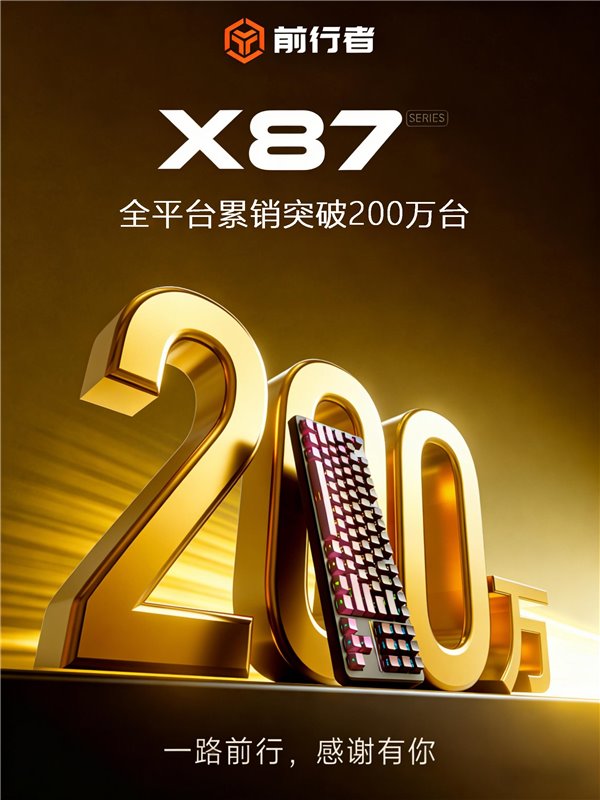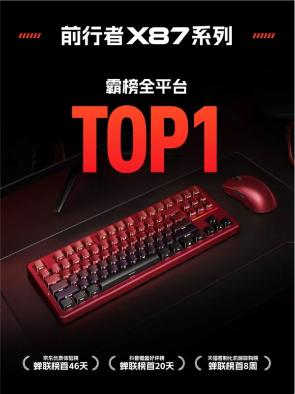 获奖的X87系列,全年销量突破200万台,是前行者产品哲学的最佳注脚。在2025年双十一及年终大促期间,X87系列更是在天猫、京东、抖音三大平台的“客制化机械键盘回购榜”、“优质体验榜榜”上持续霸榜,多次斩获细分品类销量TOP1,成为名副其实的国民级爆款。 它的成功,不在于用了最贵的轴体或芯片,而在于精准定义并解决了“第一把机械键盘用户”的复合痛点——不单是硬核的参数性能,关键在于体验上的越级满足。