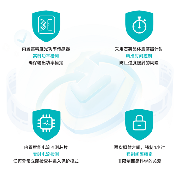 (2)在使用过程中,4大实时安全防护系统,包括实时照射功率监测,确保输出功率恒定;实时LED光源电流监测,避免电流突变。遵循《重复低强度红光照射辅助治疗儿童青少年近视专家共识(2022)》中“红光眼部照射每次不应超过3分钟”的规范,避免长时间照射感觉不适;遵循上述红光共识“2次治疗的间隔至少4小时以上”的核心建议,以强制物理间隔的方式,从机制上确保两次照射的间隔时间符合共识标准,确保安全。