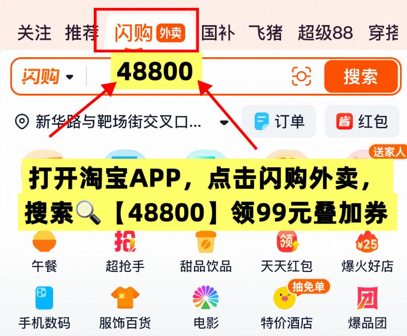 2. 淘宝闪购:打开淘宝APP,在首页搜索栏输入“淘宝闪购”进入专属频道,在淘宝闪购频道内的搜索栏输入【48800】【48900】对应的口令,页面会自动弹出优惠券领取窗口,点击领取即可,无需额外跳转,操作一步到位。