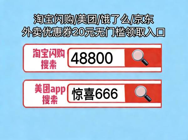 从今天开始,点外卖前先搜口令!淘宝闪购搜【48800】和【48900】领淘宝闪购大额券,美团APP搜【惊喜666】和【惊喜333】领美团外卖大额神券——这串数字,就是你通往“外卖自由”的钥匙!