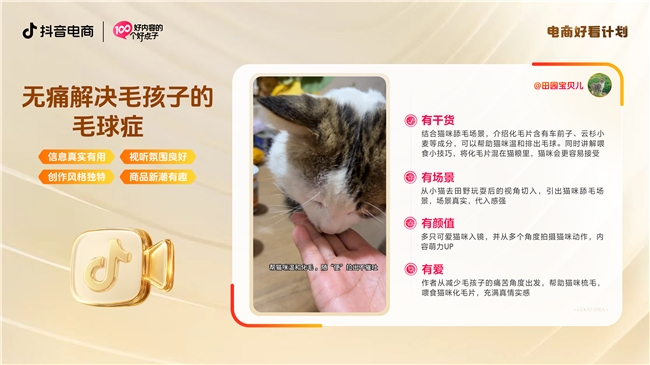 @田园宝贝儿 就灵活应用以上公式,打造出养宠好内容。她分享养宠干货,结合猫咪舔毛场景,细致介绍产品成分和喂食小技巧,帮助猫咪温和化毛,排出毛球。视频里,多只可爱猫咪入镜,作者多角度拍摄猫咪的可爱状态,满满“萌”力;同时,记录猫咪去田野玩耍后,一身“粘花粘草”,自然展现猫咪舔毛场景,吸引养宠人关注。作者真心关爱猫咪,用兼具专业和温度的内容打动养宠人,建立用户信任、推动下单。