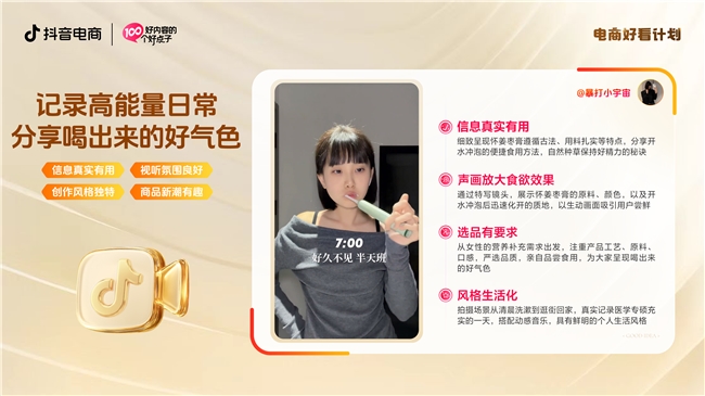 当然,这些爆款内容并非孤立存在,其背后都有一套清晰可复用的内容方法论作为指引。为帮助更多作者系统掌握这套内容方法论,抖音电商升级「电商好看计划」,围绕 “信息真实有用、视听氛围良好、创作风格独特、商品新潮有趣” 四大维度,鼓励更多作者打磨内容品质,高效创作好内容。同时,平台从不同行业甄选出优质的抖音电商好看内容,将这些好点子收录进「好内容的 100 个好点子」案例集,为作者们提供参考和灵感。