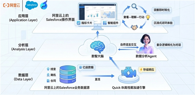 阿里云上的 Salesforce 和 Quick BI 的联合方案发布,标志着企业 CRM 系统正式迈入“智能经营”新阶段。方案以“业务驱动数据,数据反哺业务”为内核,将 CRM 的流程管理能力与 Quick BI 的商业分析能力深度耦合,构建覆盖数据、洞察、行动的闭环智能体系。