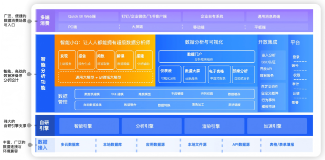 Quick BI 以大模型为智能中枢、多 Agent 协同为执行架构,构建了 BI+AI 全链路数据分析体系,提升效率和深度,降低分析门槛。用户可通过对话,获取数据、解读数据、生成报表与深度报告。支持 70+ 种数据源连接与数据集快速创建,可对数据进行即时分析与查询;通过拖拽式操作实现数据可视化呈现,轻松制作专业美观的分析效果。