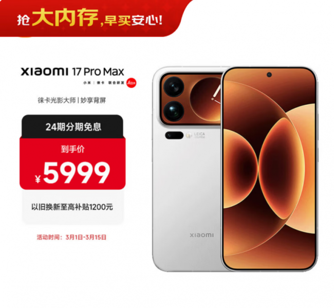 小米17 Pro Max搭载妙享背屏,支持动态通知,显示打车、外卖、航班等信息,还可切换音乐、接听电话、远程控车;可通过超级小爱圈选正屏内容,一键移至背屏显示;主摄超清自拍,可从背屏浏览照片及录像。后置5000万像素徕卡超高动态主摄、5000万像素徕卡超聚光潜望长焦、5000万像素徕卡超广角,其中徕卡超聚光潜望长焦创新超聚光棱镜,搭载1/2英寸超大底GN8传感器,提升暗光远摄能力。小米17 Pro Max 12GB+512GB享国补到手价5499元。