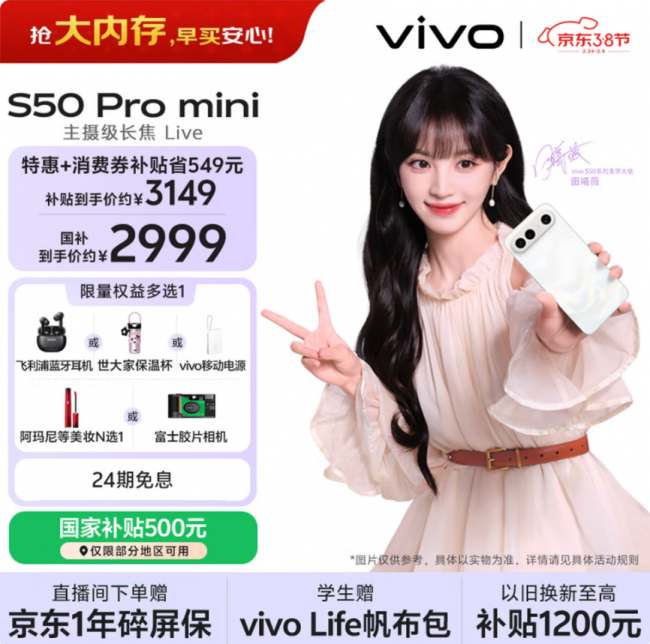 vivo S50 Pro mini采用6.31英寸轻薄小直屏,告白款薄约8.1mm、轻约193g。后置5000万像素索尼超感光仿生大底主摄、5000万像素索尼大底潜望长焦、110°超视野低畸变超广角镜头、全焦段变焦闪光灯;带来夜景闪光人像,旗舰级全焦段变焦闪光灯覆盖五大人像焦段,夜拍更出色;主摄配置索尼IMX921超感光仿生大底传感器,配置自研VCS人眼仿生技术,色彩真实、画面纯净。vivo S50 Pro mini 12GB+256GB 告白款享优惠叠加国补到手价2804.15元。