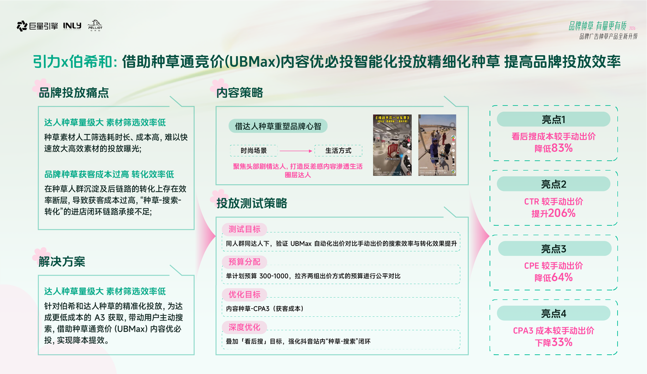 从贝亲 “养娃精算师” 的精准人群渗透,到伯希和 UBMax 素材赛马的降本增效;从和平精英明星共创破圈引爆,到创尔美结合种草通竞价提升泛进店指标助攻生意增长......8 大实战案例,共同给出了品牌种草的全新答案: