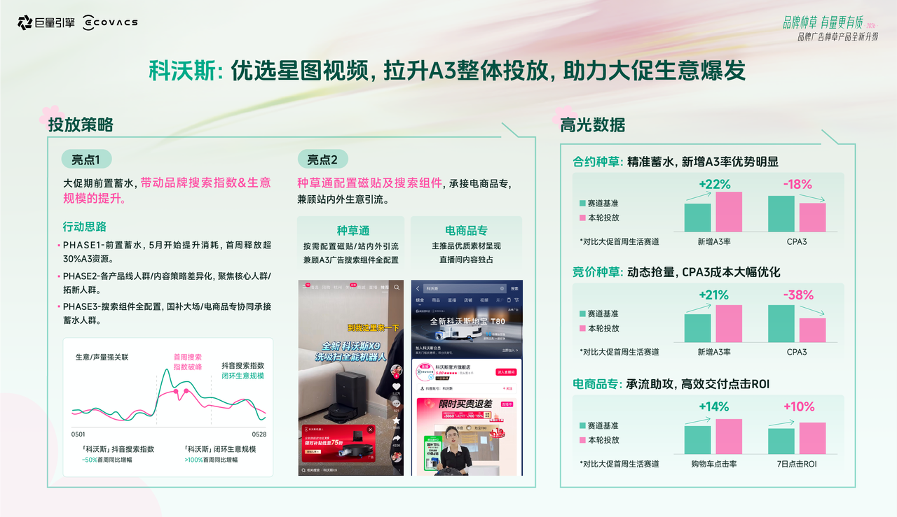 合约种草精准蓄水,新增A3率对比同周期同行业提升22%;竞价种草动态抢量,CPA3成本下降38%;电商品专成功承接种草流量,7日点击ROI提升10%。从蓄水到转化,双轮驱动在大促中跑出了节奏感。