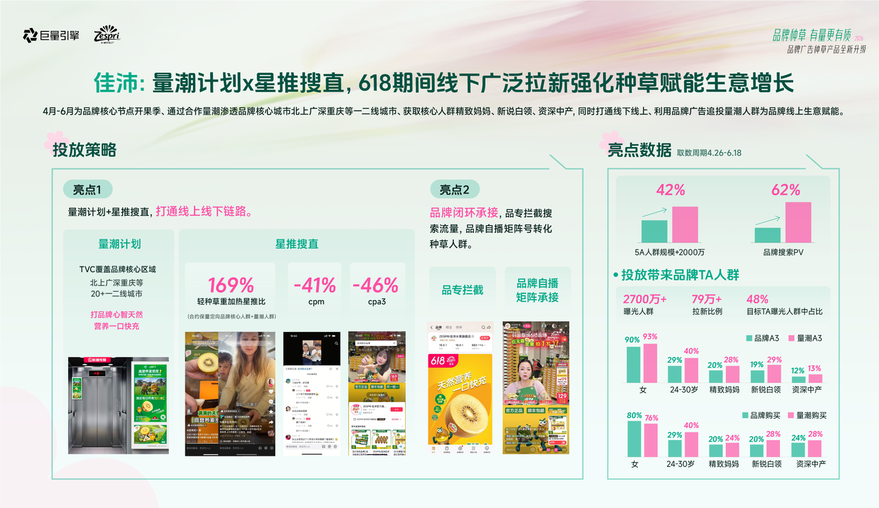 每年4-6月是佳沛的“开果季”。为了最大化覆盖核心人群并扩大曝光,带动618线上销量增长,佳沛打通线上线下营销场景,实现全域覆盖。