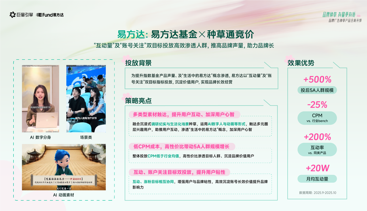 投后品牌5A人群规模提升5倍,流量成本CPM降低25%,互动率提升2倍——这套“双目标”打法,为金融品牌的长期经营提供了新思路。