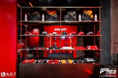 在另一侧,衍生品区域将品牌语言转化为可被携带的物件——主题卡包、行李牌与巧克力礼盒,使“杜卡迪红”从视觉延伸至日常使用的触感之中。